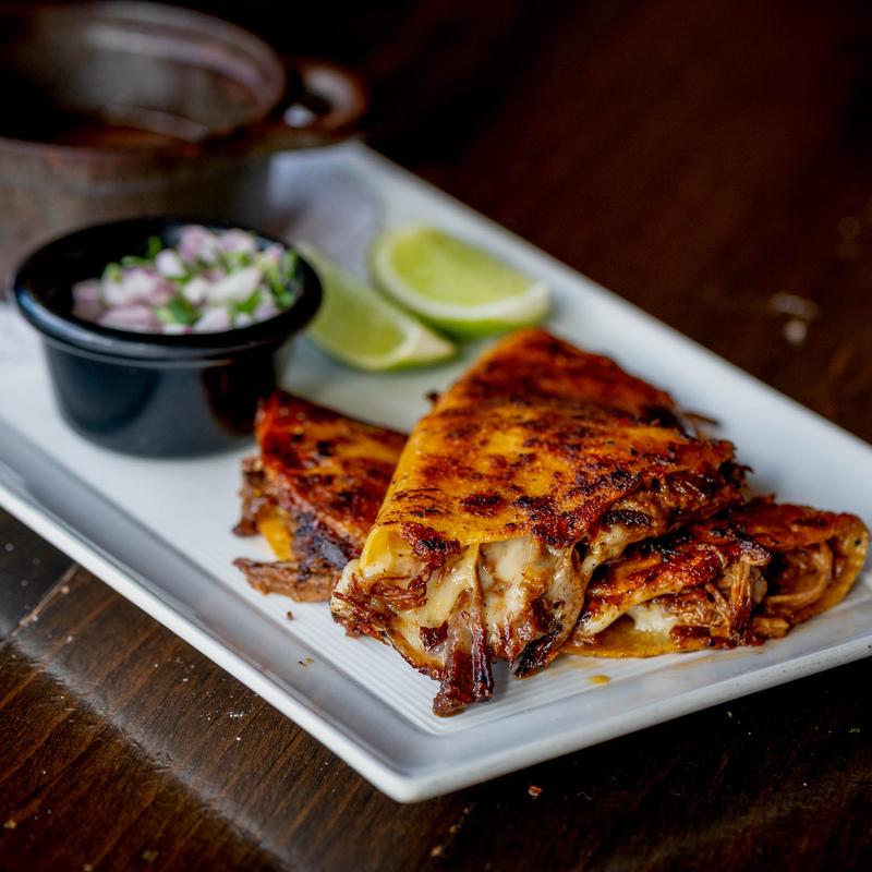 Grilled steak, golden brown cheese tortilla, pickled onion, pico, avocado mousse, red Morita sauce