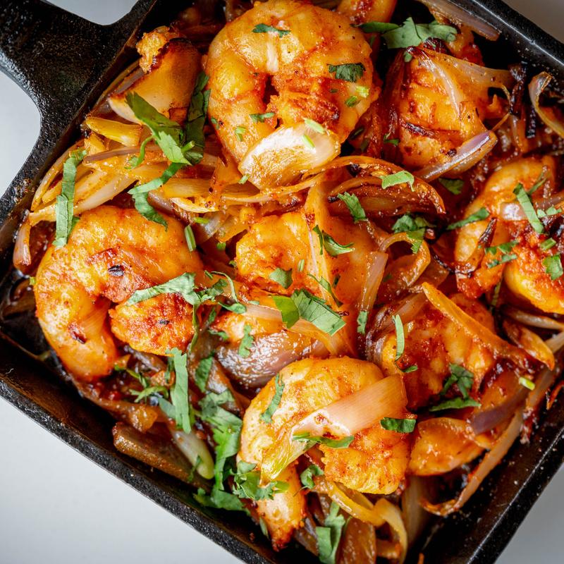 Cast iron skillet garlic-shallot shrimp